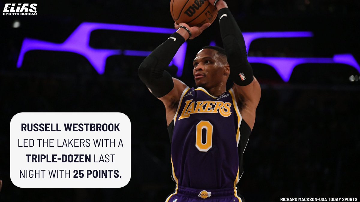Elias Sports Bureau On Twitter Russell Westbrook Led The Lakers With A Triple Dozen Last Night With 25 Points Lakeshow The Only Other Lakers With A Triple Dozen With 24 Points Elgin Baylor Three Times Jerry West 1 Kareem Abdul Jabbar 1 Magic